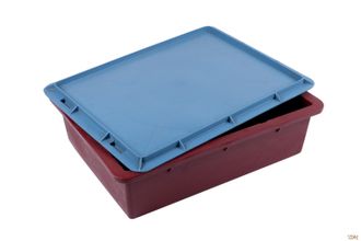 Ящик сплошной с крышкой, вкладываемый. С вентиляционными отверстиями в самом верху ящика, пломбируемый, цвет разный, вес 1,58кг, материал ПЭНД с добавлением вторичного сырья.